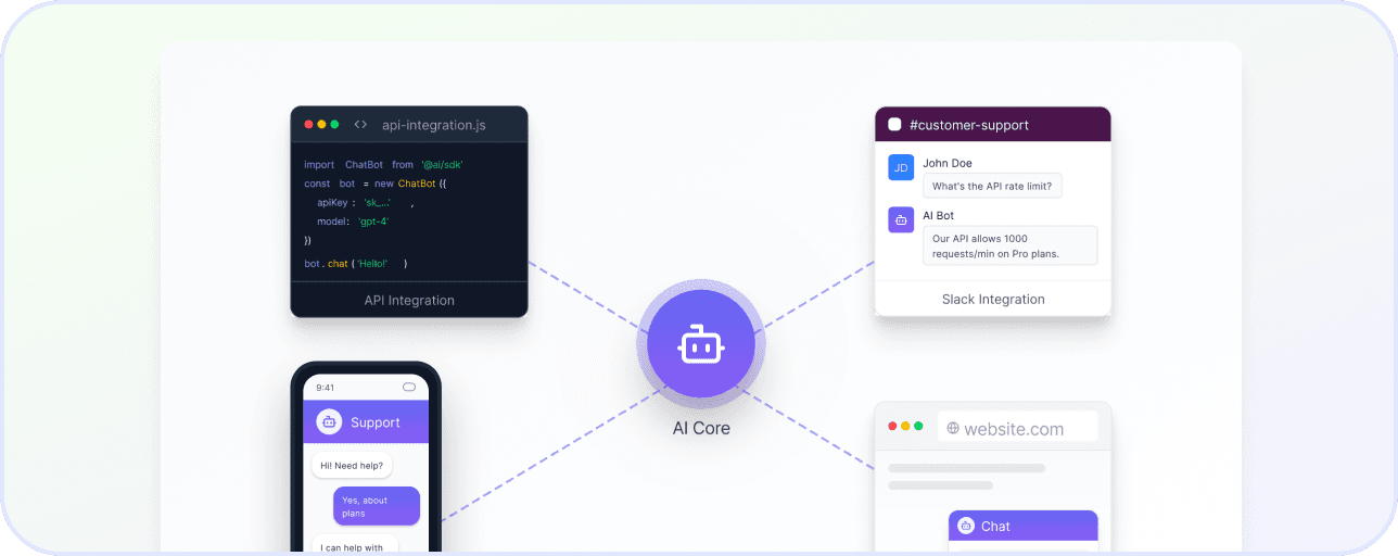 Add to your website with one line of code, connect to Slack, or integrate via API. Your AI is ready to help customers across all channels. All these for free!